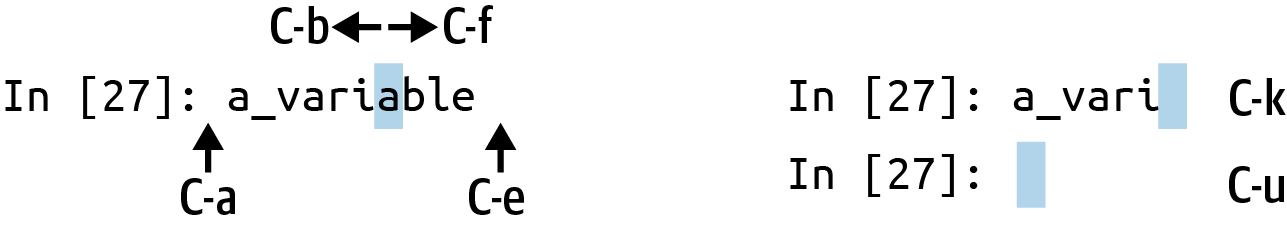 IPython has many keyboard shortcuts for navigating the prompt (which will be familiar to users of the Emacs text editor or the Unix bash shell) and interacting with the shell’s command history. Table B.1 summarizes some of the most commonly used shortcuts. See Figure B.1 for an illustration of a few of these, such as cursor movement.